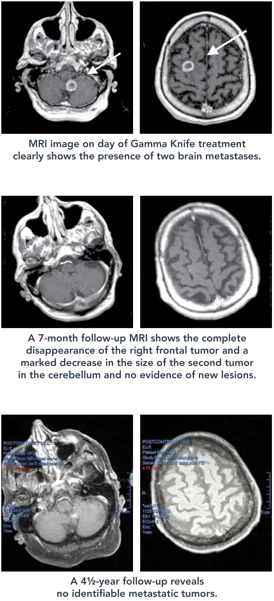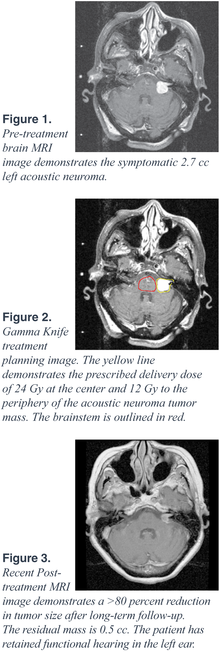 We have continued to follow the patient on a semiannual basis since her Gamma Knife Stereotactic Radiosurgery. She has had improvement of her tinnitus and has retained functional hearing in the left ear. Three-years after treatment, her most recent MRI revealed a 0.5 cc residual mass with necrotic center, which represents a greater than 80 percent reduction in size, as well as diminished radiographic enhancement. The patient maintains her active life and is a world traveler. She will continue to be followed by our Gamma Knife treatment team on a semiannual basis.
